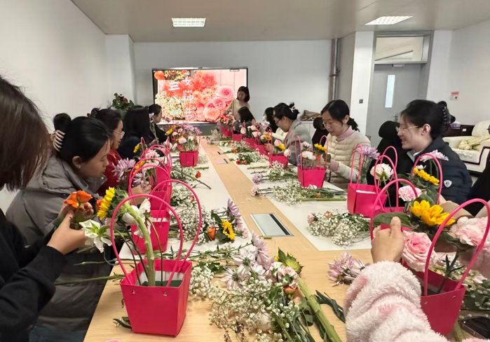 在馨香氤氲的氛围中,师生们紧扣“初心”主题,结合马年新春的美好寓意,发挥创意,精心修剪。片刻间,一朵朵散落的鲜花在粉色手提花袋中焕发出新的生机,化作一束束独一无二的艺术作品。创作间隙,师生们相互交流心得、切磋技艺,不时传来欢声笑语,在花香中拉近了距离,凝聚了情谊。作品完成后,大家纷纷手持佳作合影留念,定格这份春日美好。